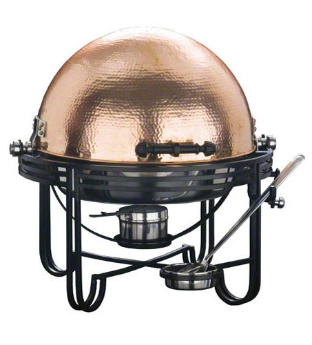 This 180 degree roll-top chafer is made of stainless steel. It includes 22 gallon food pan, water pan and 2 fuel holders. This chafer has hammered copper cover with minimal seams to make it easy to clean. Beautiful wrought iron trim and a convenient built-in spoon rest. This roll-top chafer rotates a full 180 degree for service but is easy to roll back to its closed position to keep interior food warm. Comes with 6-quart capacity and round shape.